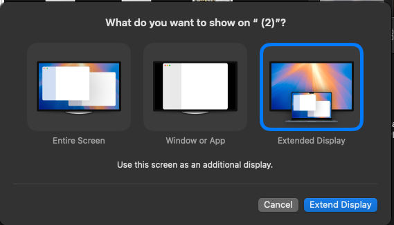A window will pop up. On this, choose extended display. Do this for both of the displays, and things will hopefully be back to normal.